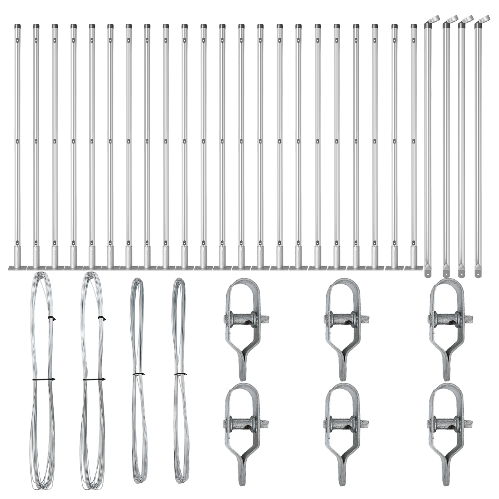 • Delivery Contains: 22 x stĺp, 4 x uhlohlavý stĺp, 22 x základná doska, 22 x plastový kryt, 66 x plastový podporný drôt, 4 x kryt uhlohlavého stĺpa, 4 x hardvér uhlohlavého stĺpa, 6 x napínač, 2 x 25 m viazací drôt, 2 x 80 m napínací drôt