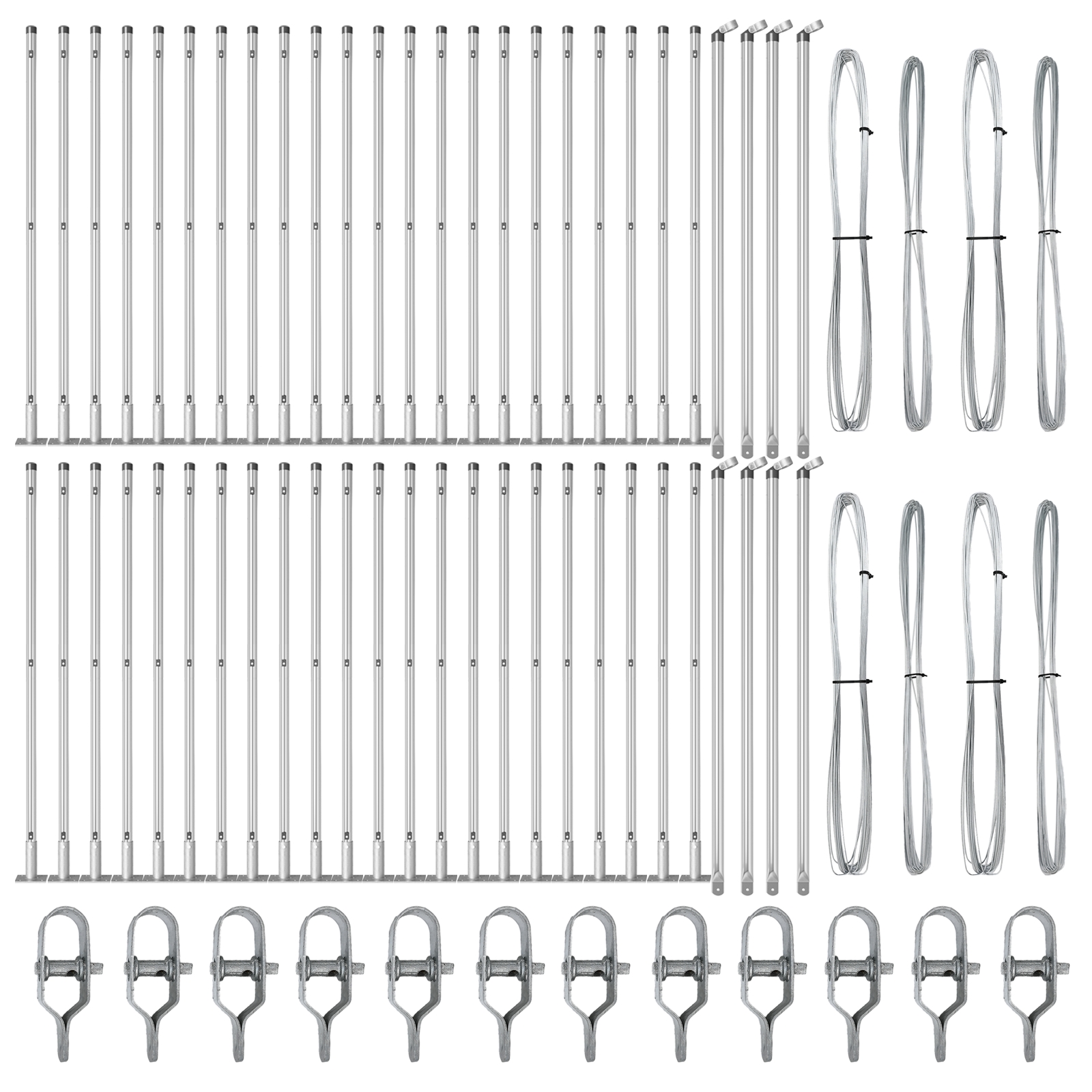 • Delivery Contains: 44 x stĺp, 8 x uhlový stĺp, 44 x základová doska, 44 x plastový kryt, 132 x plastový podporný drôt, 8 x kryt uhlového stĺpa, 8 x hardvér uhlového stĺpa, 12 x napínač, 4 x 25 m viazací drôt, 4 x 80 m napínací drôt