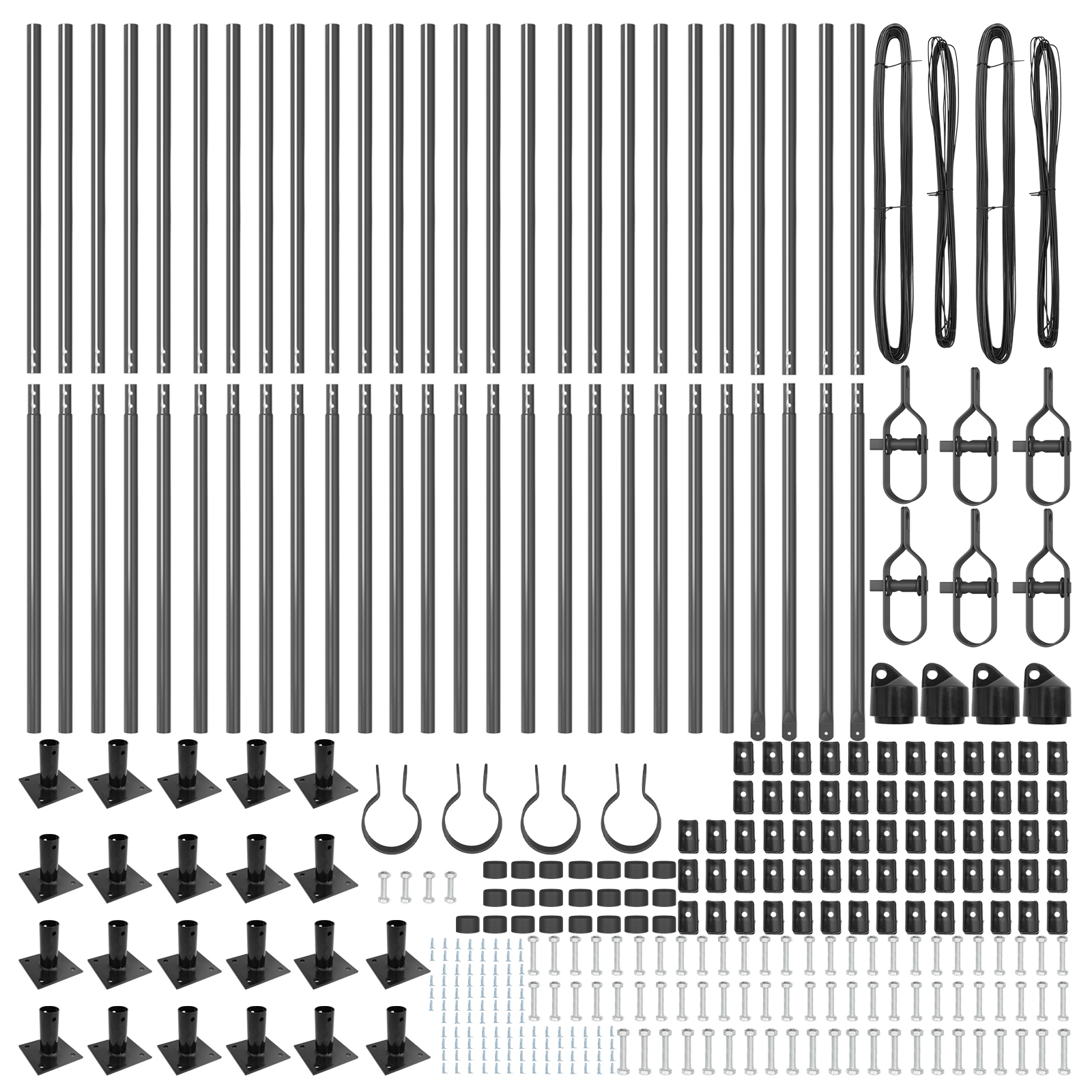 • Delivery Contains: 22 x Stĺp, 4 x Uhol stĺp, 22 x Základná doska, 22 x Plastová čiapka, 66 x Podporovací kábel z plastu, 4 x Čiapka z uhla stĺpa, 4 x Hardvér pre uhol stĺpa, 6 x Napínač, 2 x 25 m Vázací drôt, 2 x 80 m Napínací drôt