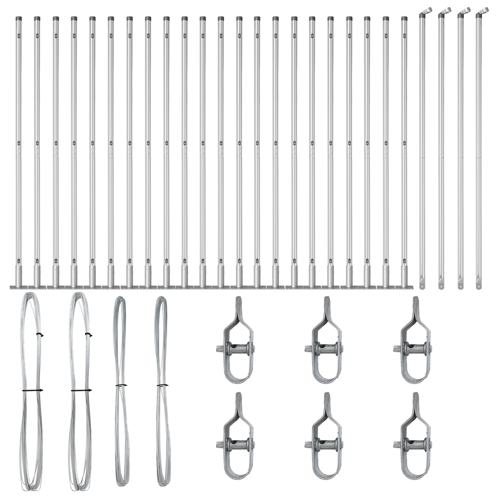 • Delivery Contains: 22 x stĺp, 4 x uholník, 22 x základová doska, 22 x plastový kryt, 66 x podporný drôt, 4 x kryt uhla, 4 x montážne príslušenstvo k uhlu, 6 x napínač, 2 x 25 m viazacieho drôtu, 2 x 80 m napínacieho drôtu