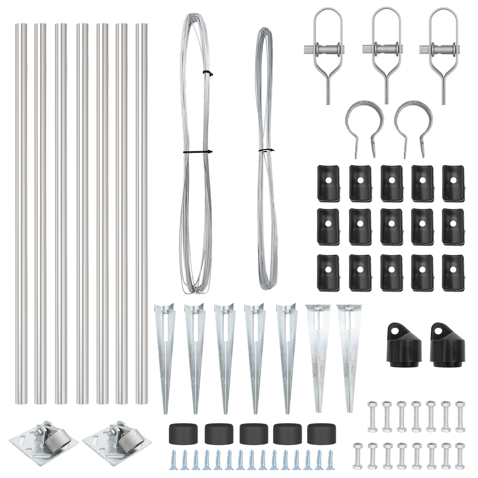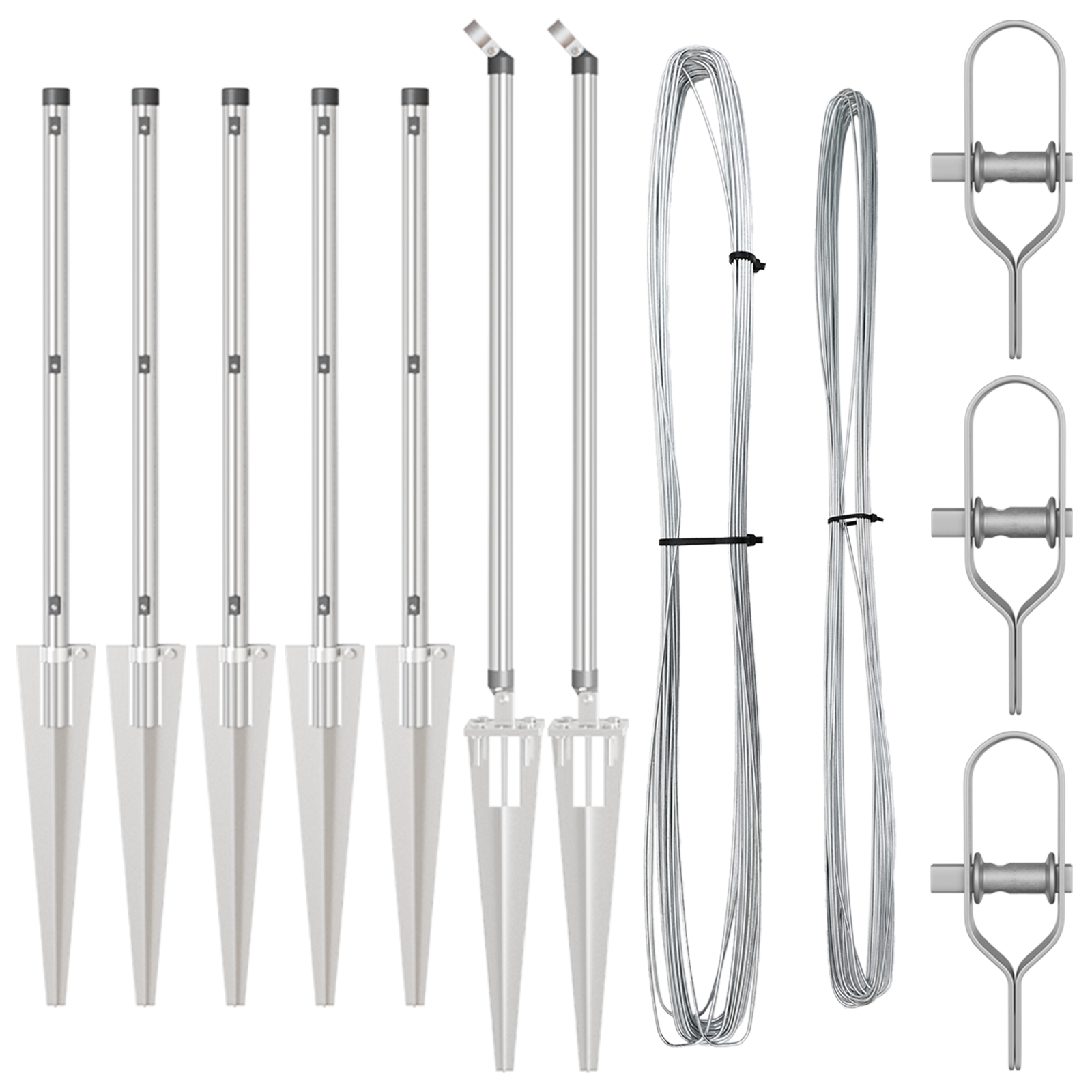 • Dodávka obsahuje: 5 x stĺpik, 2 x uhlový stĺpik, 5 x kolík, 2 x uhlový kolík, 5 x plastová krytka, 15 x podporný drôt, 15 x skrutka na plastovom podporovači, 2 x uhlová krytka stĺpiku, 2 x hardvér uhlového stĺpiku, 3 x napínač, 1 x 25 m viazací drôt, 1 x 33 m napínací drôt