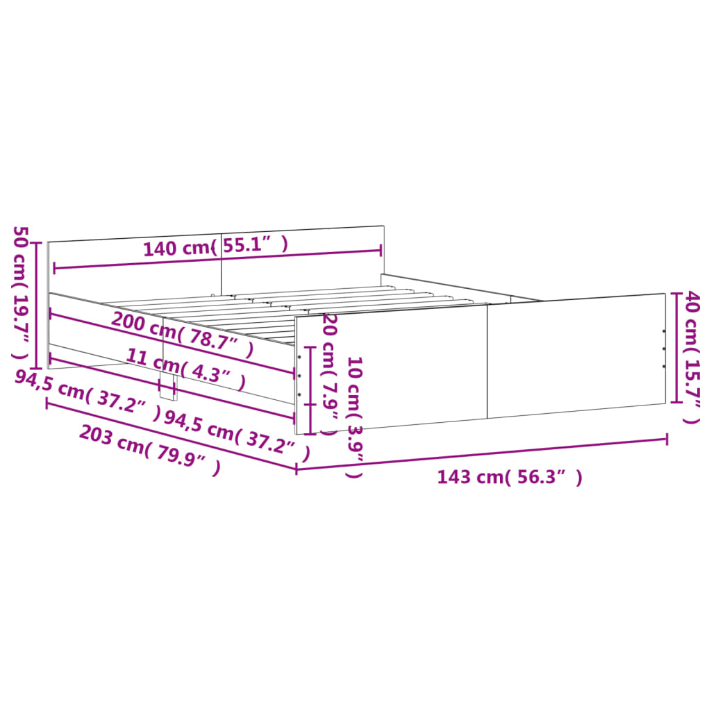 vidaXL Posteľný rám s čelom a opierkou nôh čierny 140x200 cm