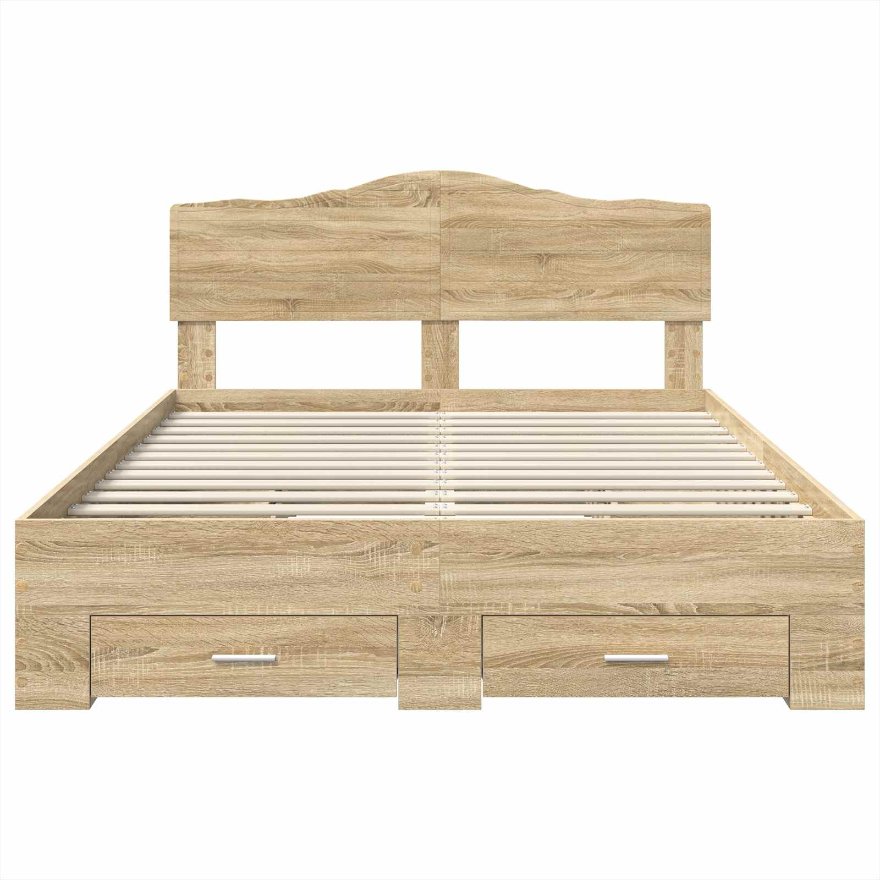 - Funkčné súčasti: Rám postele s pevnými lamelami ponúka stabilný základ pre pohodlný spánok. Čelo postele z kompozitného dreva dopĺňa celkový vzhľad a poskytuje pohodlie. Zásuvky, ktoré sú vyrobené z rovnakého materiálu, sa bez problémov integrujú do rámu a zvyšujú úložný priestor bez obetovania štýlu.