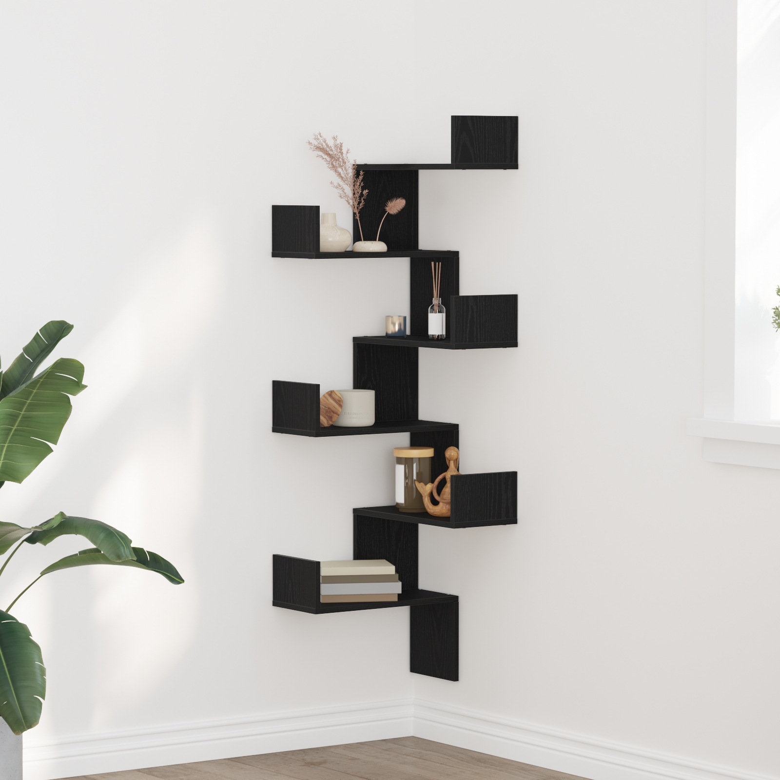 Táto rohová skrinka v čiernom dube je moderným a praktickým úložným riešením pre akýkoľvek domov. Jej šikovný dizajn jej umožňuje perfektne sa akurát prispôsobiť do rohu, čo robí perfektnou voľbou na maximalizáciu priestoru v obývačke, spálni a pracovniach.