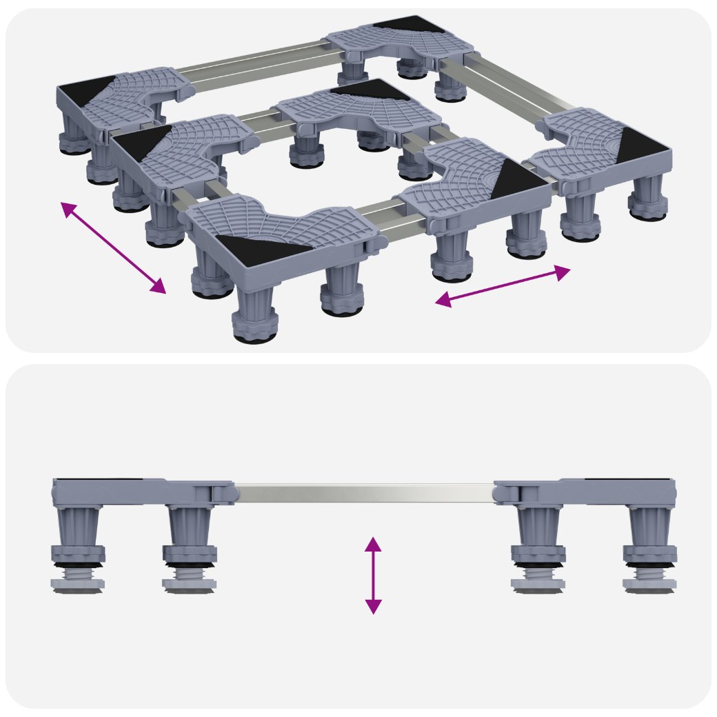 • Nastaviteľná veľkosť: Tento nastaviteľný základ sa dá meniť v šírke a dĺžke, aby sa prispôsobil rôznym velikostiam spotrebičov. Či už máš kompaktné alebo plnohodnotné spotrebiče, určite sa prispôsobí, čo ti dodá flexibilitu do budúcna.