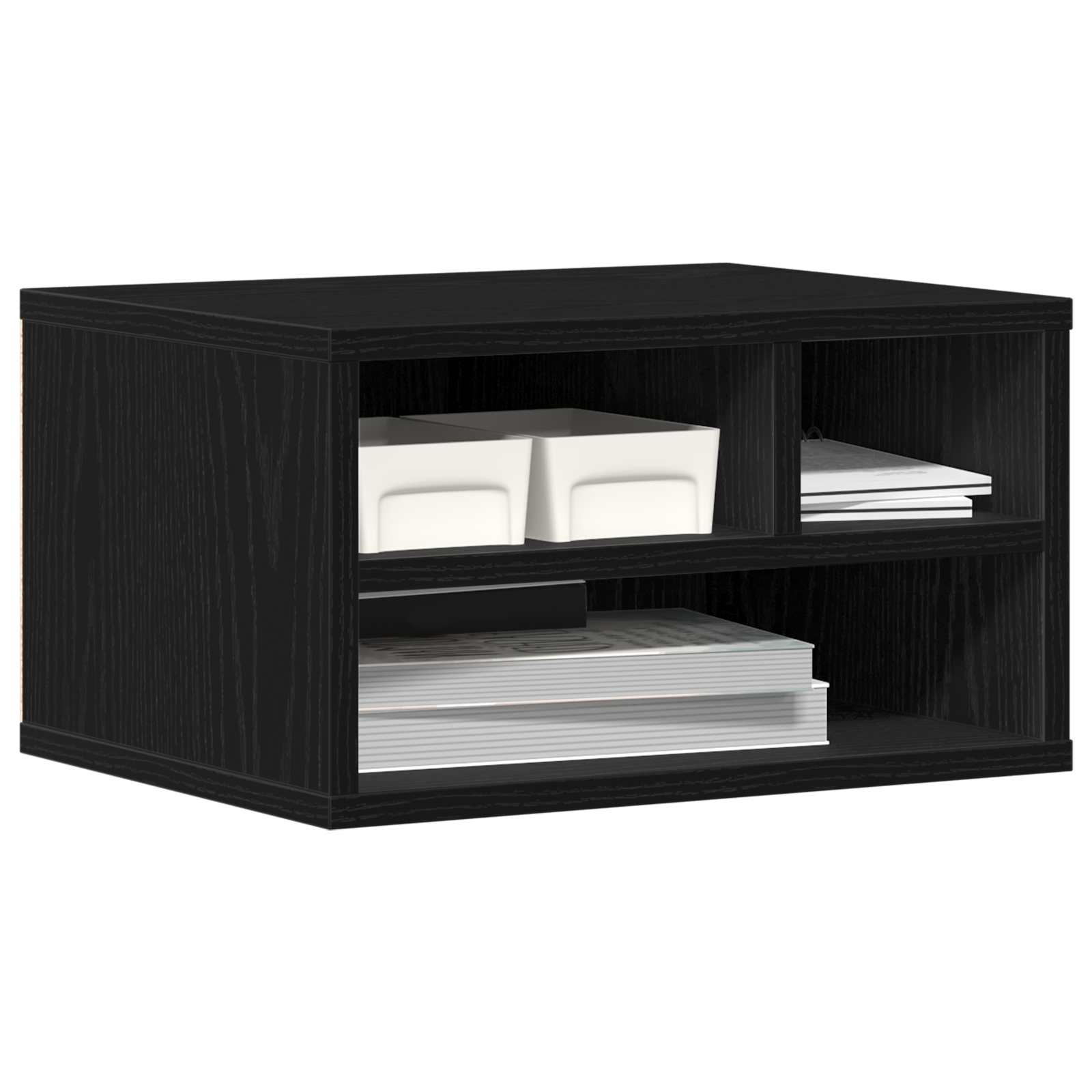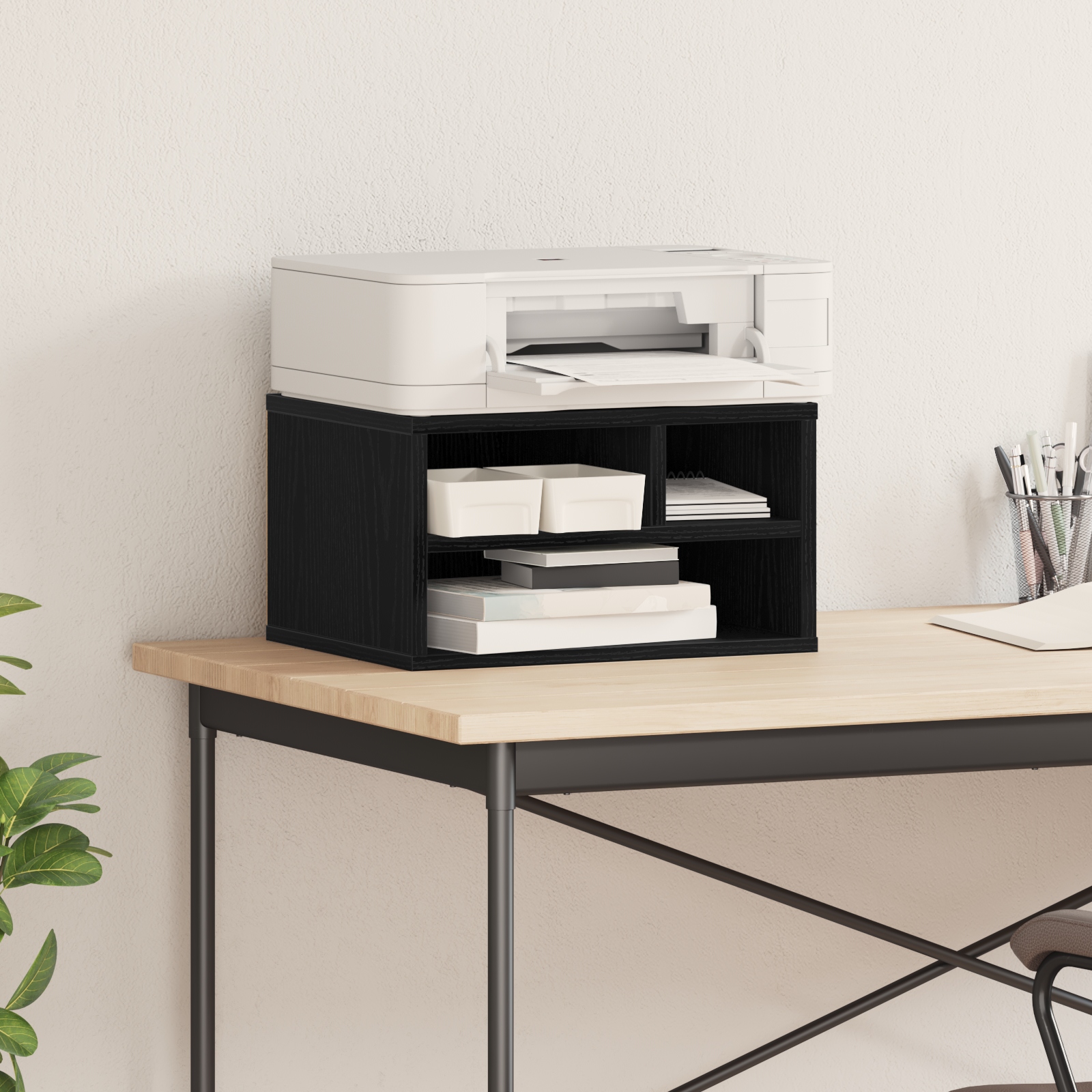 Tento moderný čierny dubový stojan na tlačiareň je štýlovou a praktickou voľbou pre akúkoľvek kanceláriu. Jeho čisté línie a jednoduchý dizajn sú ideálne na úhľadné uskladnenie a efektívne využitie pracovného priestoru, či už doma, alebo v kancelárii.