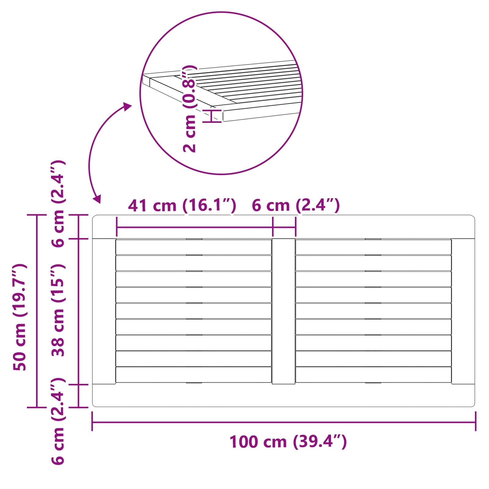 Tento obdĺžnikový stôl (100 x 50 x 2 cm) kombinuje praktické využitie s krásou masívneho týkového dreva. Elegantný lamelový dizajn mu dodáva moderný vzhľad, ideálny na jedlo aj na neformálne stretnutia, a prináša teplú atmosféru do každej miestnosti.
