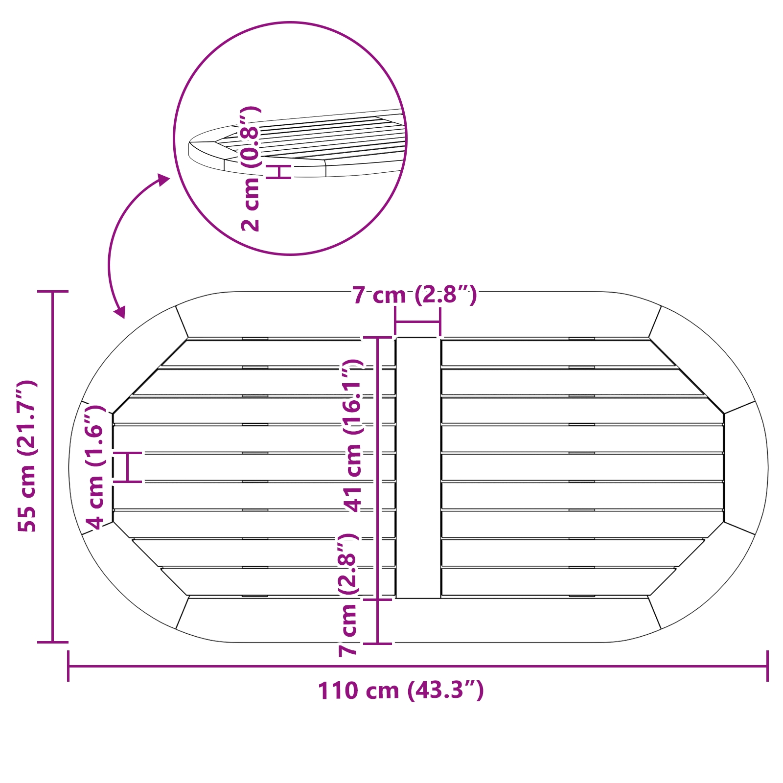 Tento oválny stôl, s rozmermi 110 x 55 x 2 cm, ukazuje skvelú čistotu a praktickosť masívneho akáciového dreva. Elegantný a moderný vzhľad sa hodí do akéhokoľvek prostredia, či už ide o stolovanie alebo menšie stretnutia. Nádherné teplé drevené tóny dodávajú pocit pohodlia a štýlu.