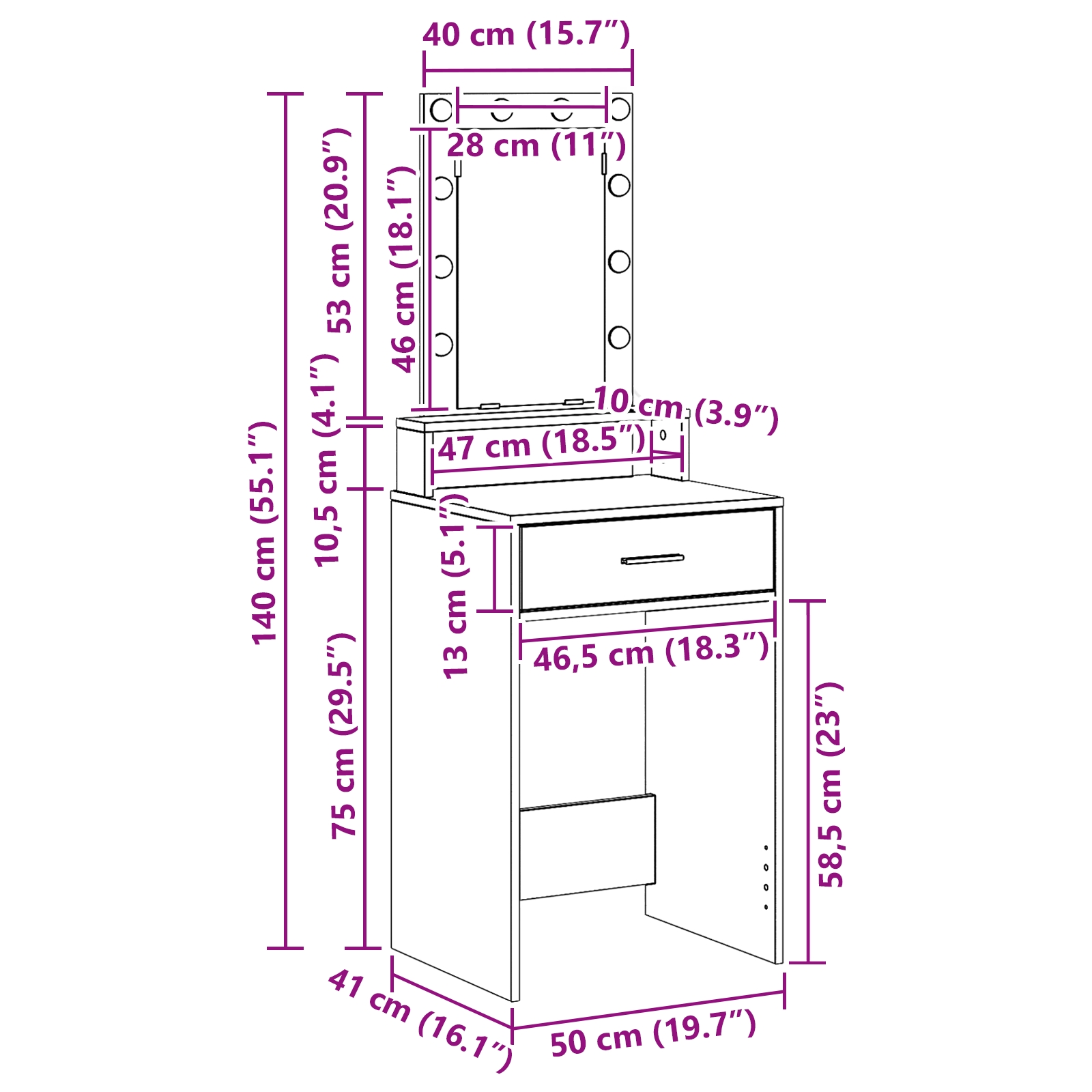 • Dostatok úložného miesta: Tento toaletný stolík ponúka veľa miesta, čo uľahčuje udržiavať tvoju kozmetiku a beauty produkty usporiadané. S viacerými zásuvkami a plávajúcou policou je všetko na svojom mieste a rýchly prístup je zaručený.