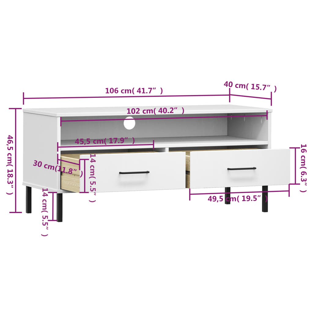 vidaXL TV skrinka s kovovými nohami biela masívna borovica OSLO