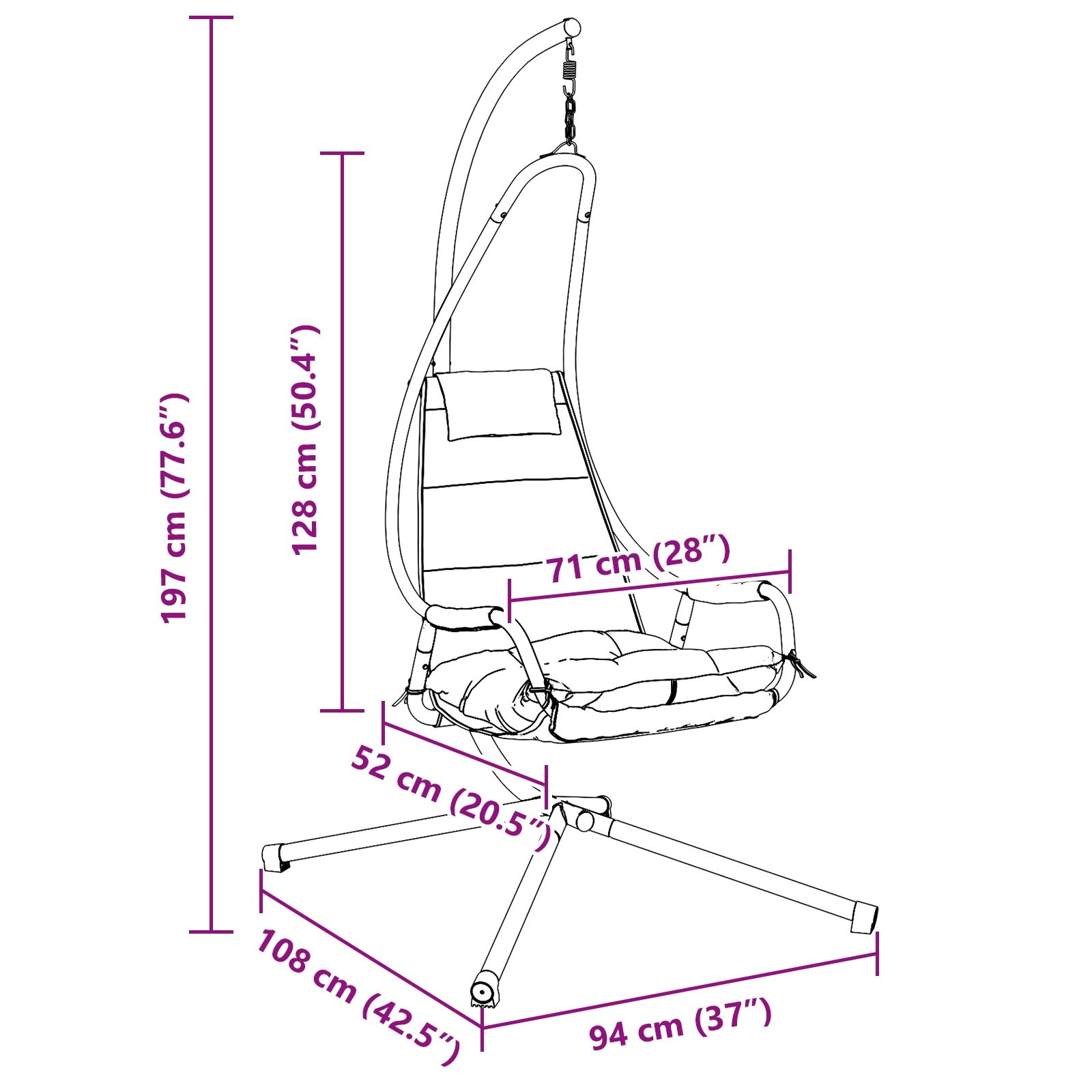 • Robustná konštrukcia: Vyrobená z pevných kovov a mäkkej látky, táto hojdačka poskytuje silnú oporu a pohodlie pri sedení. Je ideálna na vonkajšie relaxovanie.
