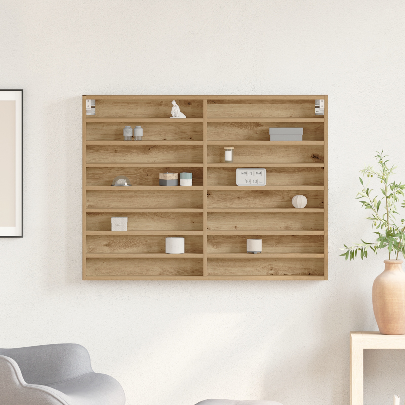• Priestranné Ukladanie: Táto nástenná vitrine je navrhnutá na množstvo ukladania, čo uľahčuje vystavovanie zbierok, kníh alebo dekoratívnych predmetov v usporiadanom štýle.