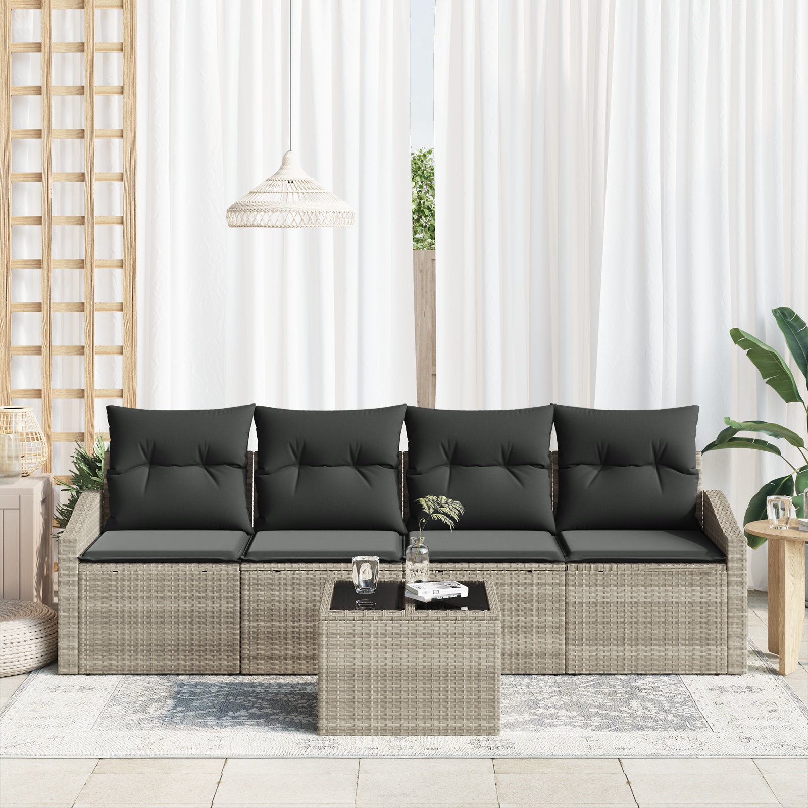 Táto 5-dielna záhradná sedacia súprava je stvorená pre vonkajšie bývanie. Kombinuje moderný dizajn s praktickosťou. Štýlový poly ratanový rám v svetlo šedej farbe a pohodlné antracitové vankúše vytvárajú čerstvý vzhľad a zabezpečujú pohodlie pre každého. Ideálne na oživenie terasy alebo záhrady.