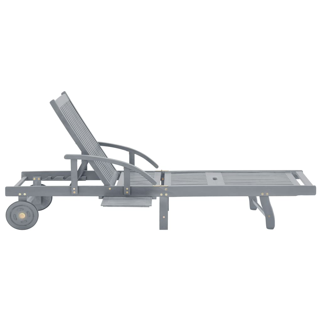 Toto vonkajšie ležadlo je vyrobené z masívneho akáciového dreva so sivým premývaným náterom, vďaka čomu je robustné a stabilné. Operadlo a opierka nôh sú nastaviteľné a lehátko môžete zaistiť v požadovanej polohe. Toto záhradné ležadlo sa dá ľahko premiestňovať po dome pomocou 2 koliesok. Lehátko má pohodlný výsuvný stolík na umiestnenie telefónu, slnečných okuliarov, nápojov a iných drobností. Vankúš vám dodá ďalšie pohodlie počas oddychu. Každý vankúš je vybavený dvoma sadami šnúrok, aby ste ho mohli pevne pripevniť k lehátku.