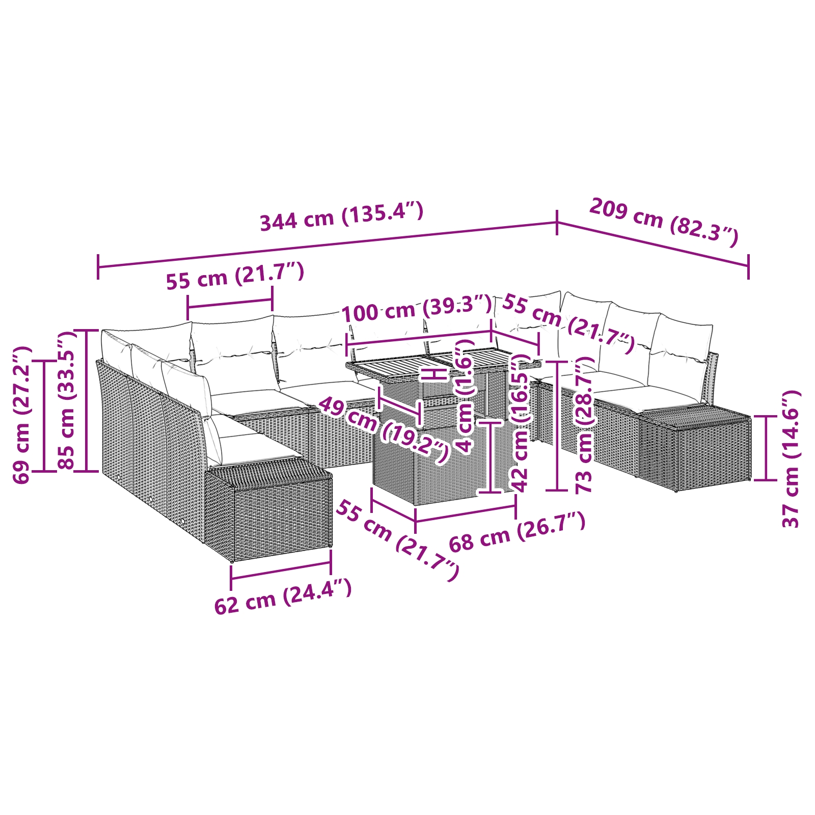 • Priestranné sedenie: Navrhnuté tak, aby pohodlne usadilo až desať osôb, tento set je skvelý na rodinné stretnutia a stretnutia s priateľmi. Priestranné rozmery prispejú k vítajúcej atmosfére.