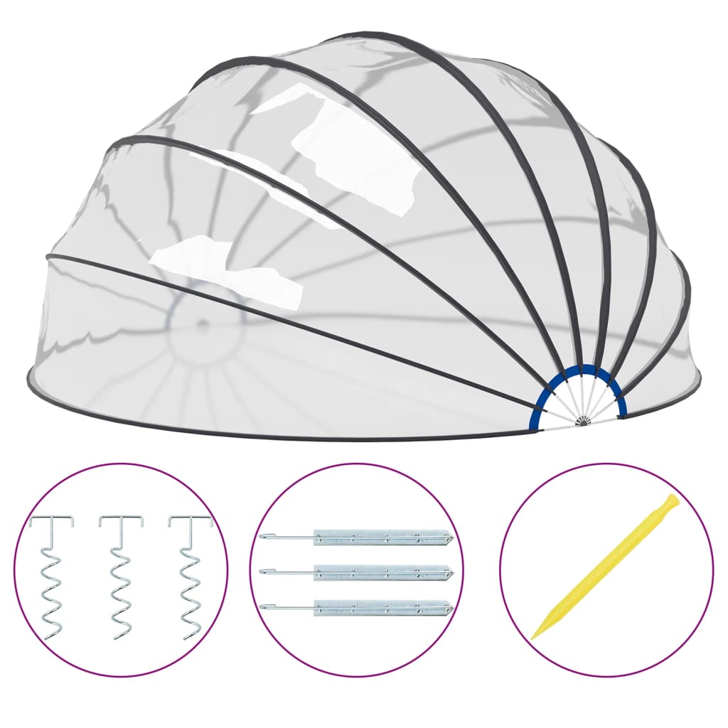 Kryt na bazén je vyrobený z PVC s UPF 30 a má konštrukciu zo sklolaminátu. Poskytne vám vynikajúcu ochranu pred slnkom a dažďom. Postará sa o to, aby sa do bazéna nedostalo lístie, hmyz, prach a ďalšie nečistoty z vonka. V prípade potreby dokáže zabezpečiť rýchlejší ohrev vody a menší únik tepla v priebehu noci. Prístrešok sa ľahko otvára vďaka jedinečnému mechanizmu s pántmi. Kryt je priehľadný, a tak vám neunikne žiadne dianie okolo bazéna. Zastrešenie bazénu sa dodáva spolu s hrotmi a hákovými klincami do zeme, pomocou ktorých ho môžete pevne ukotviť k zemi. A tak sa nemusíte obávať, že vietor toto zastrešenie bazénu odfúkne.