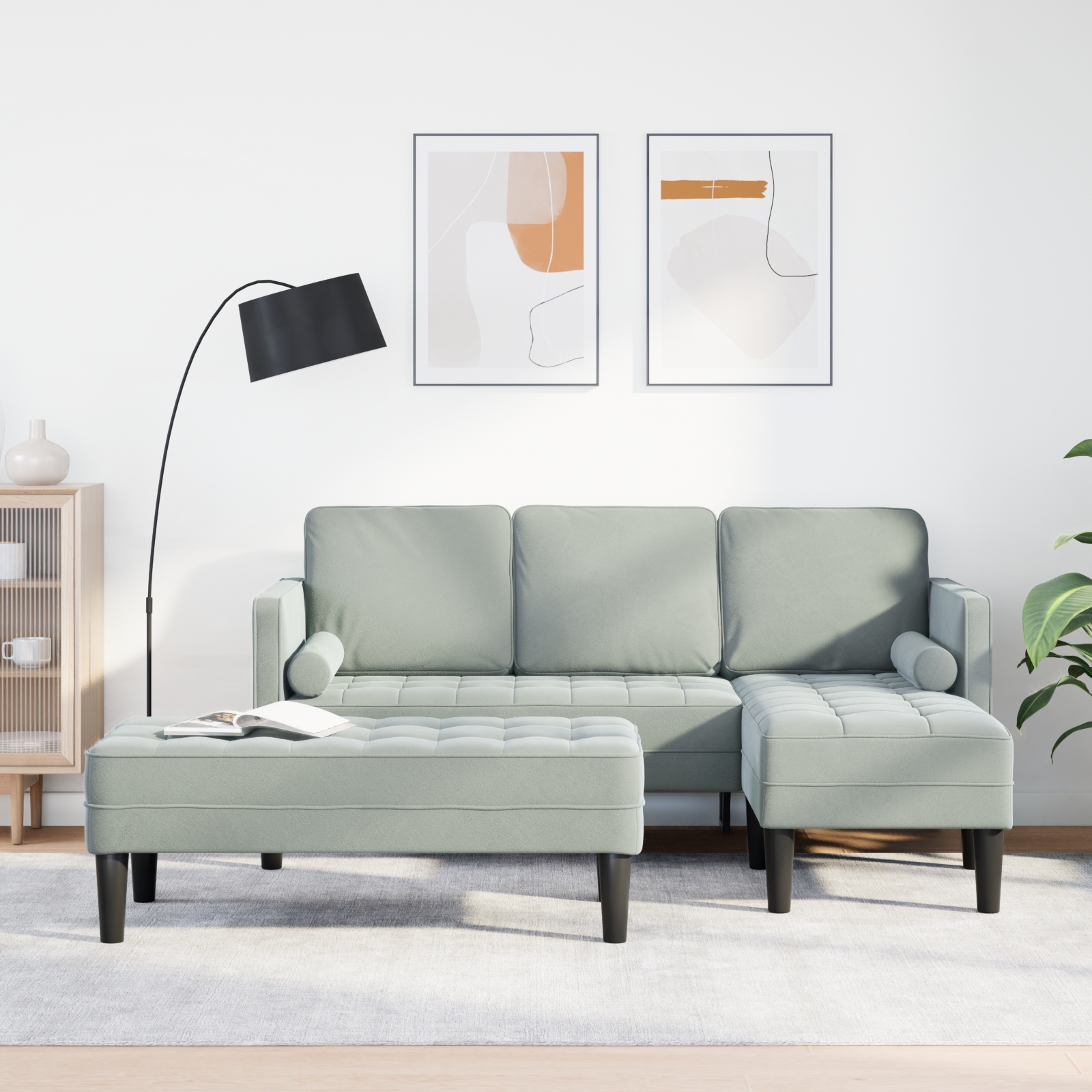 Záhradná pohovka vidaXL s lavičkou a vankúšmi L – tvarovaná svetlosivá zamatová, 3 – miestna pohovka vidaXL s chaise L – tvarovaná svetlosivá 160 cm zamatová, Záhradná lavička vidaXL svetlosivá 113 cm zamatová
