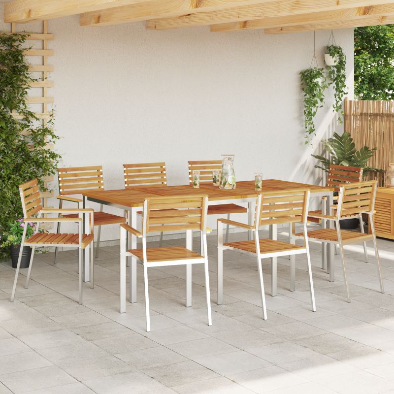 Sada sklápacích záhradných stoličiek vidaXL je vyrobená z masívneho akáciového dreva a odolného oceľového rámu s práškovou povrchovou úpravou. Dodá moderný nádych akémukoľvek vonkajšiemu priestoru. Sú ideálne na balkóny, terasy a záhrady, tieto štýlové stoličky vylepšia váš zážitok vonku s pohodlím a súčasným štýlom.